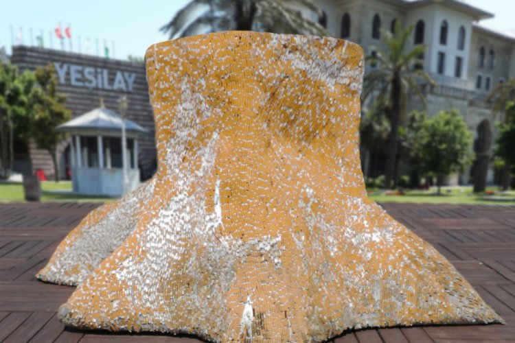 Türkiye’nin farklı illerinden toplanan 26 bin izmarit, ağaç formunda bir heykele dönüştürüldü.İSTANBUL (İGFA) - Çeşitli sivil toplum kuruluşları ve öğrencilerden oluşan gönüllü gruplar, tütün endüstrisinin çevreyi katletmesine karşı farkındalık oluşturmak için ülkemizin farklı illerindeki parklar, plajlar ve sokaklarda yıl boyunca etkinlikler düzenleyip izmarit topladı. Toplanan 26 bin izmarit, heykeltıraş Esra Öztay Güraras'ın ellerinde 1 aylık süre içerisinde ağaç görünümünde bir heykele dönüştü.Gün geçtikçe büyüyen ama insanların pek dikkatini çekmeyen, hatta birçoğunun çevre sorunu olarak görmediği bir sorun tütün tüketimi; çünkü tütünün zararını ölçen ölçümlerin çoğu, pestisit kullanımı ve kötü hava kalitesi gibi tütün ürünlerinin yol açtığı bazı zararları dışarıda bırakıyor. Oysa bu gibi etkilerinden dolayı tütün tüketiminin yaşam döngüsüne ve çevreye çok ciddi zararlar verdiği biliniyor. Öte yandan, sigara izmaritleri, her yıl 766,6 milyon kilogram zehirli çöple dünya çapında en çok atılan atık madde. Tütün tarımının, küresel ormansızlaşmanın yaklaşık %5’ini oluşturduğu da biliniyor.İlk kez Cumhurbaşkanı Recep Tayyip Erdoğan’ın “Dünya Tütünsüz Günü” vesilesiyleCumhurbaşkanlığı Külliyesinde gençlerle bir araya geldiği toplantıda gösterilen “İzmarit Ağaç Heykeli”,tütün ürünlerinin çevrede yol açtığı tahribatı göstermek için uzun süreli sergilenmek üzere İstanbul Sirkeci’de bulunan Yeşilay Genel Merkezi Sepetçiler Kasrı’na getirildi.İzmarit ağaç heykeli, Yeşilay’ın bahçesinde sigara izmaritinin doğada yol açtığı tahribatı sanatın diliyle çarpıcı bir şekilde ortaya koyacak.