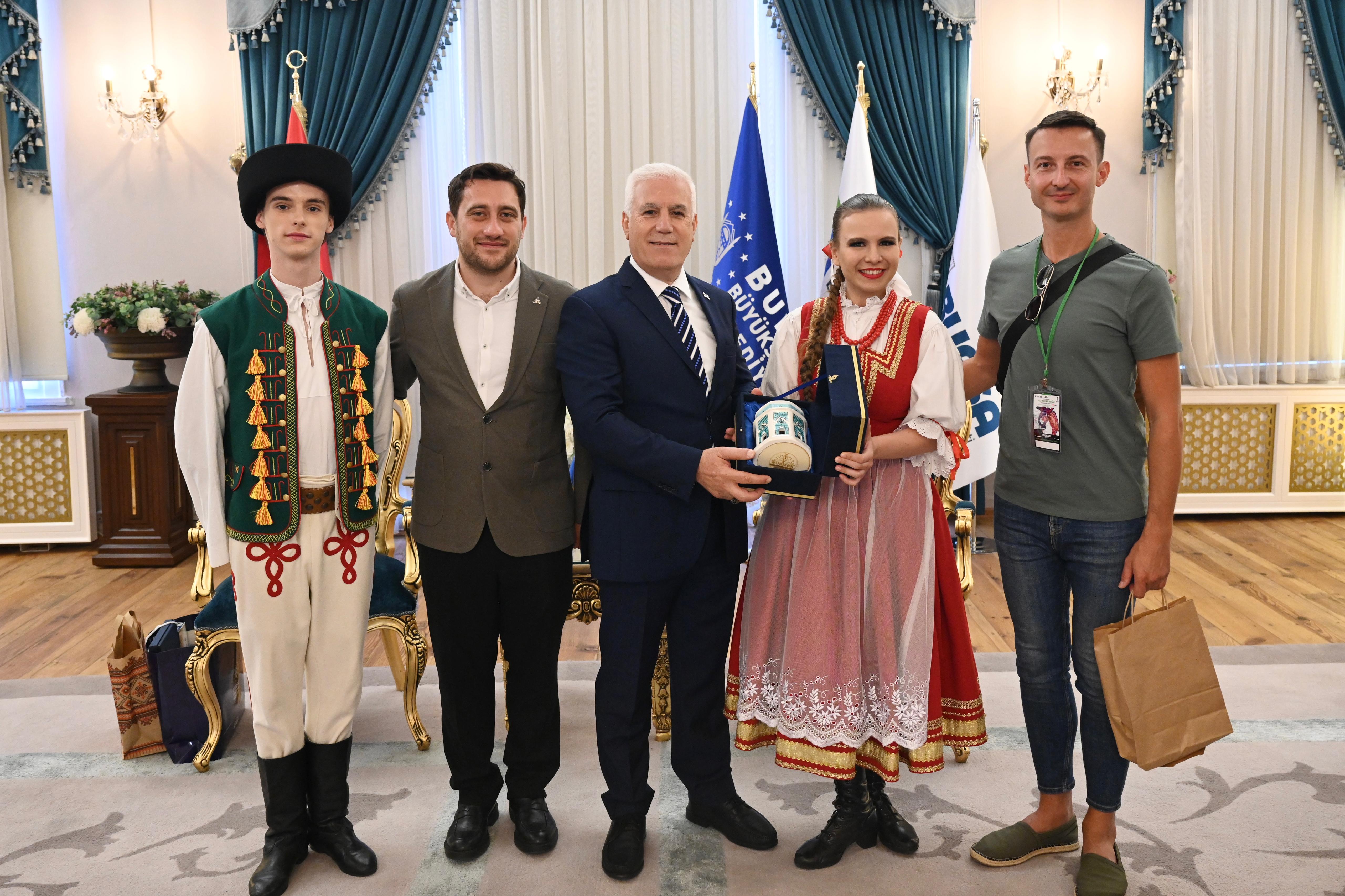 BKSTV Yönetim Kurulu Başkanı Metin Atış’ın da yer aldığı ziyarette Başkan Bozbey, misafir ekiplerle samimi bir ortamda sohbet etti. Festivalle ülke kültürlerini buluşturarak dünyaya barış mesajları vermenin amaçlandığını söyleyen Başkan Mustafa Bozbey, birçok medeniyete ev sahipliği yapan Bursa’nın tarihinden aldığı güçlü mirası geleceğe taşıdığını belirtti.