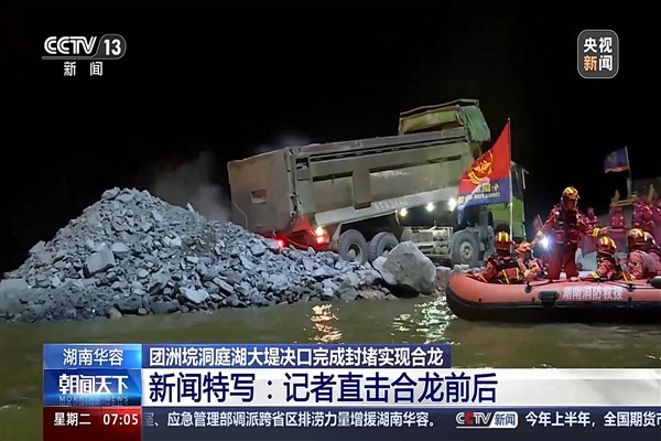 Çin'in Hunan eyaletinin Yueyang kentine bağlı Tuanbei köyü yakınlarında yer alan Dongting Gölü Tuanzhou Barajının çöken kısmının mühürleme çalışmaları dün saat 22.30 civarında tamamlandı.Mühürleme çalışmaları beklenenden çok daha erken bitirildi. Hibya Haber Ajansı