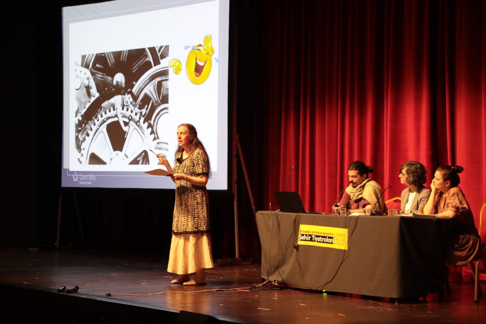 Londra Shakespeare Globe Theater’da tiyatro ve psikoloji dallarında çalışmalar yapan Londra Queen Mary Üniversitesi’nde Yaratıcı Sanatlar ve Ruh Sağlığı Bölümü’nde öğretim görevlisi olan Dr. Maria Grazia Turri, İBBŞT Çağdaş Gösteri Sanatları Merkezi ve Beykoz Üniversitesi iş birliğiyle, Harbiye Muhsin Ertuğrul Sahnesi’nde “Tiyatro, kahkaha ve bilinçdışı: Komedi Nasıl Güçlendirir ve Neyi Reddeder?” başlıklı kurumsal tiyatrolarda seyirci politikaları araştırmaları çerçevesinde bir seminer verdi.Maria Turri, tiyatroda seyirci deneyiminin, bilinçdışını da içeren karmaşık algı süreçlerini kapsadığını, seyircilerin bilinçdışı duygulanımlarının tiyatronun sosyal değerinin taşıyıcısı olduğunu ve henüz bu konunun çok fazla çalışılmadığını aktardı.Turri’ye göre tiyatrodaki bilinçdışı duygulanımsal süreçler, psikanalitik aktarımı aynalamakta. Karakter, oyuncu ve seyircinin bilinçdışı süreçleri birbirini dönüştürmekte.Maria Turri seminerde Londra Shakespeare Globe Theater’da seyircilerin erken modern tiyatro metinlerindeki komik karakterlere nasıl tepki verdiklerini incelediği deneysel çalışmayı, örneklerle aktardı. Trajik olanla komik olanın seyirci tarafından nasıl güçlü ya da zayıf algılandığına dair bilgiler verdi. Bu verilerin istatistiksel açıdan kanıtlanabilir veriler olduğunu aktardı.